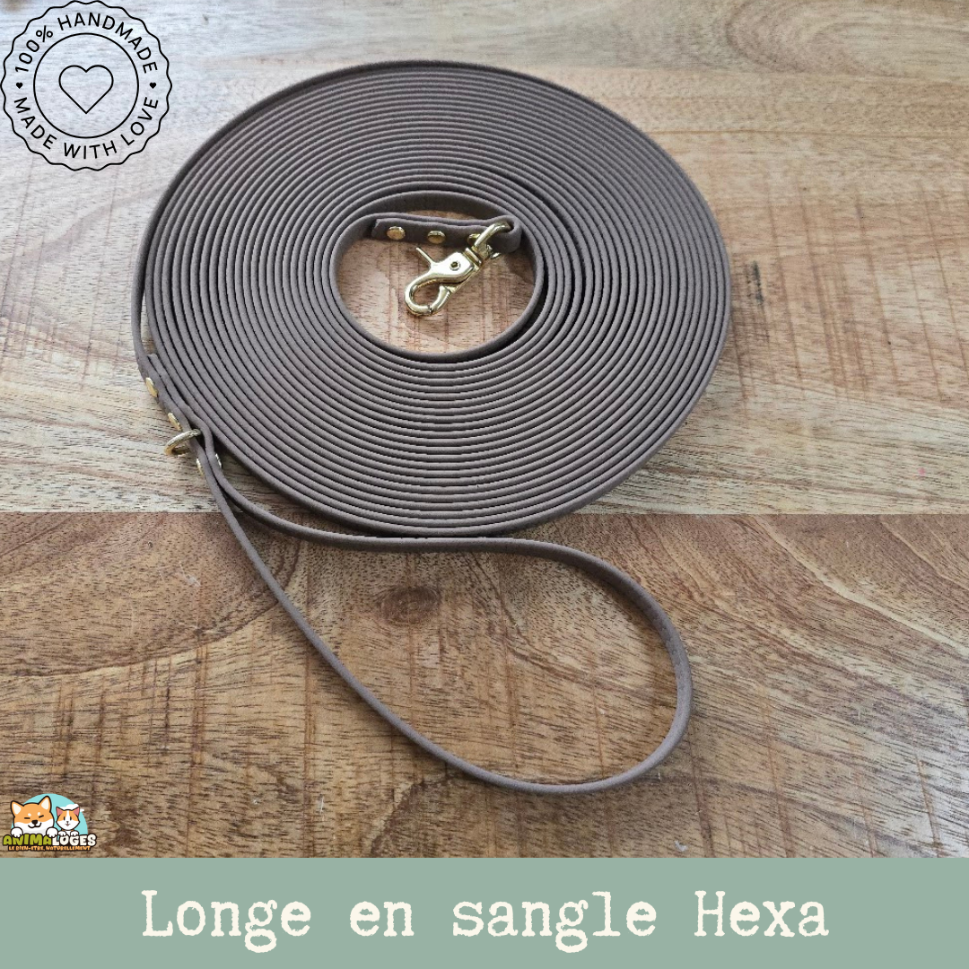 Longe pour chien fabriquée à la main en sangle HEXA de 10 mm, à la fois très souple, résistante et imperméable. Idéale pour les balades, l’éducation ou le rappel, elle ne retient ni l’eau ni la saleté et se nettoie facilement. Allie durabilité, confort et esthétisme pour un usage quotidien.