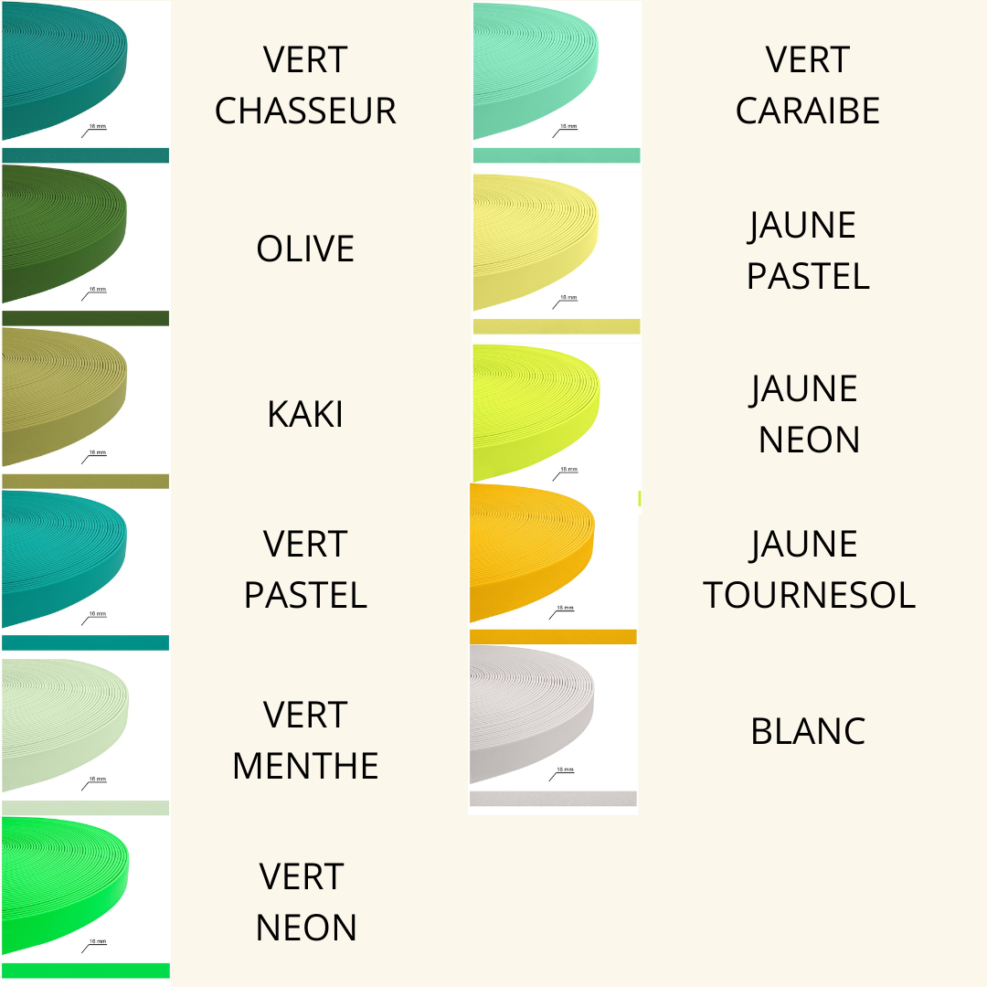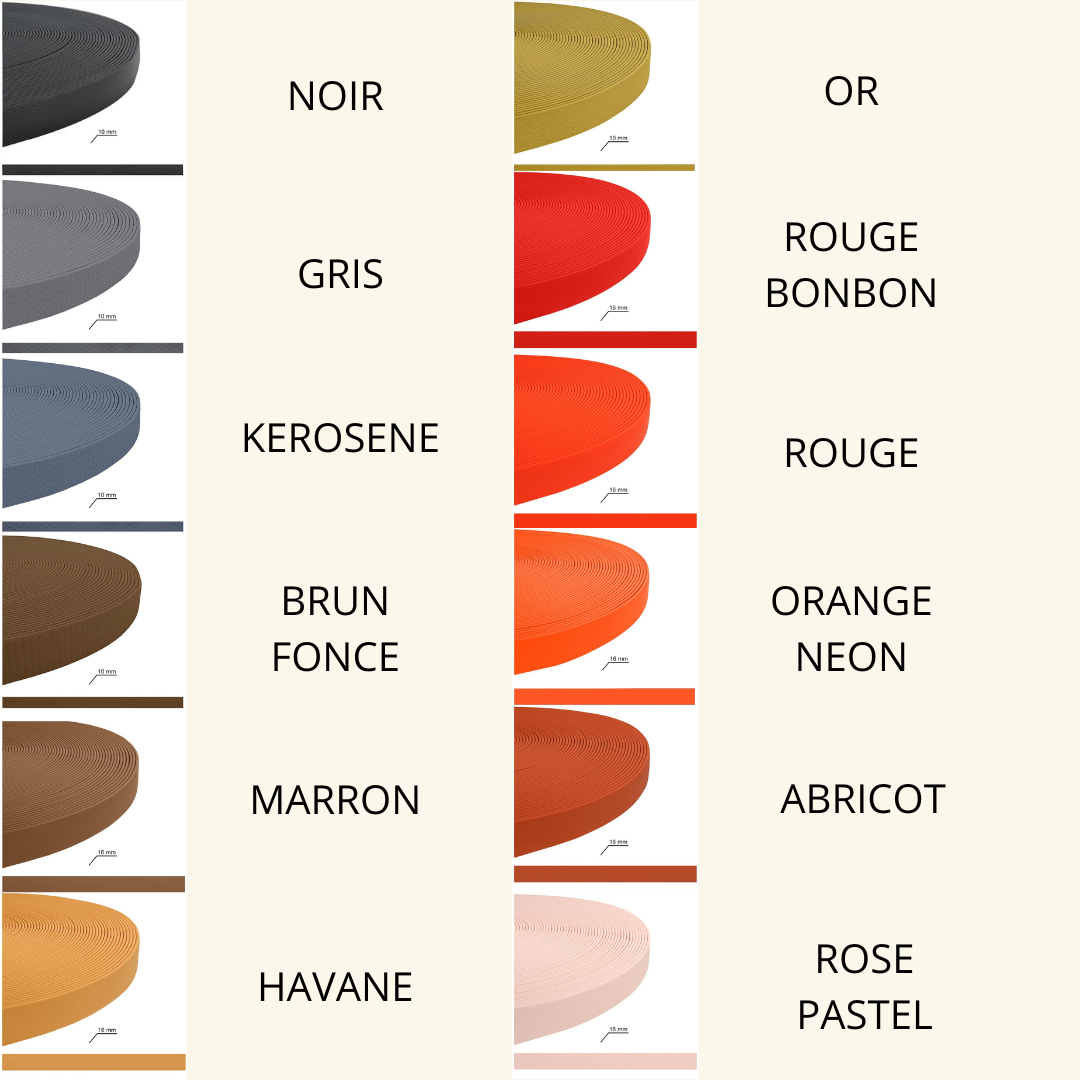 Noir, Gris, Kérosène, Brun foncé, Marron, Havane, Or, Rouge bonbon, Rouge, Orange néon, Abricot, Rose pastel, Rose néon, Rose, Viva magenta, Vin, Bleu, Bleu clair, Bleu pastel, Lavande pastel, lavande, Lilas, Violet, Pourpre, Vert chasseur, Olive, Kaki, Vert pastel, Vert menthe, Vert néon, Vert caraïbe, Jaune pastel, Jaune néon, Jaune tournesol, Blanc