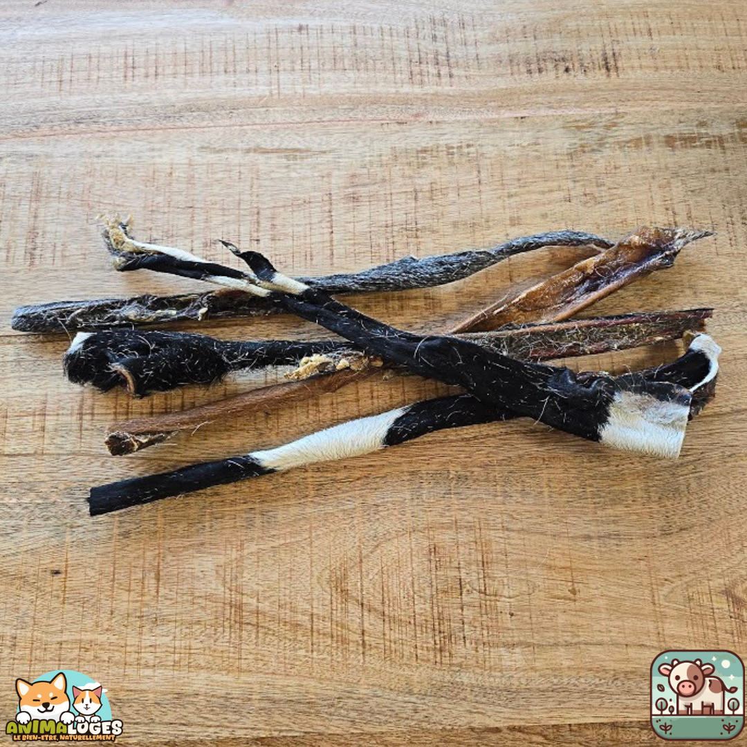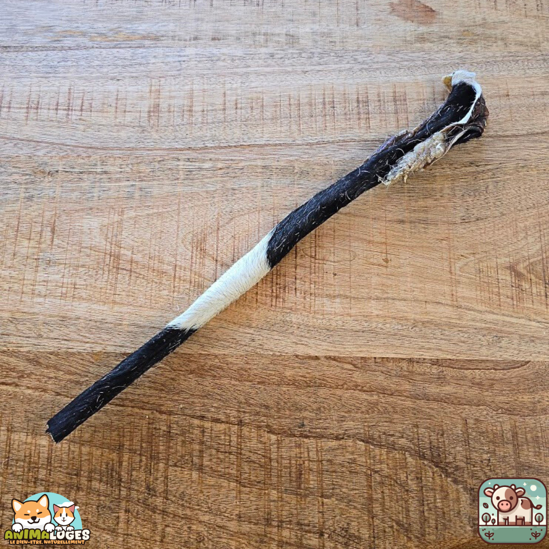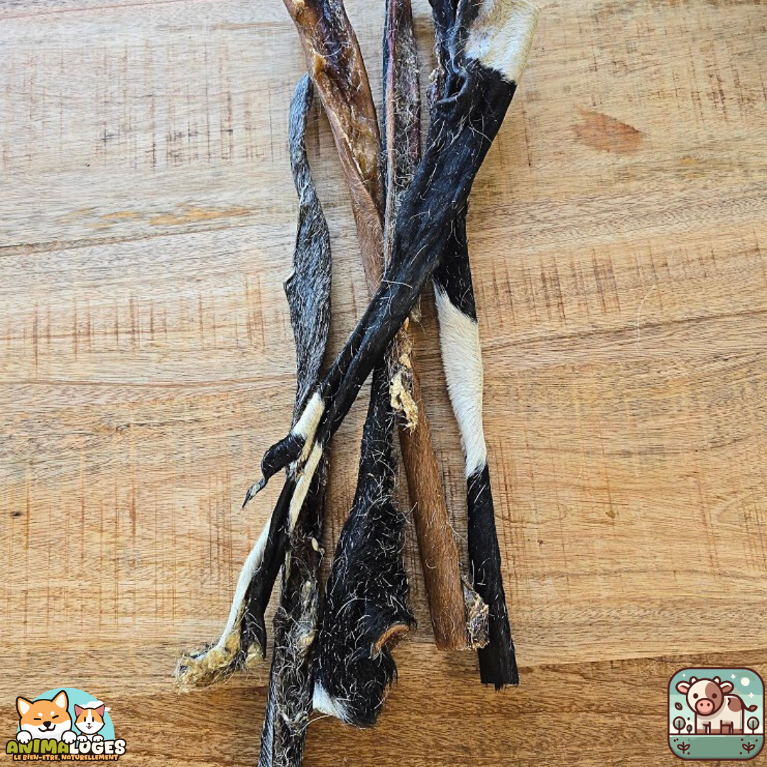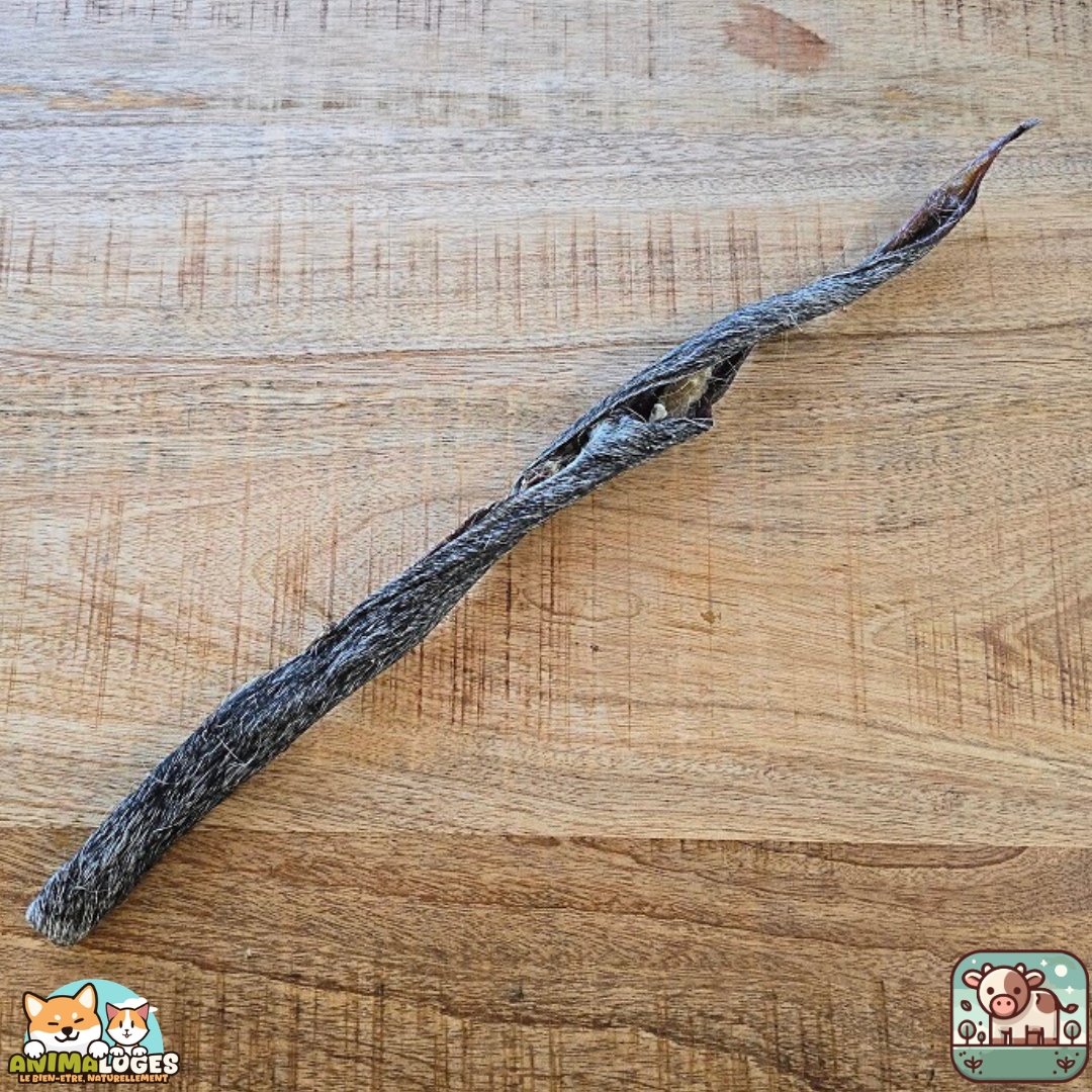 La présence de poils naturels apporte un bénéfice supplémentaire : ils participent à une action mécanique naturelle tout au long de la mastication, contribuant à une meilleure hygiène bucco‑dentaire et à une stimulation douce du transit intestinal. Grâce à sa longueur de 50 cm, cette peau est particulièrement adaptée aux chiens qui aiment mâcher longtemps et se dépenser mentalement.
