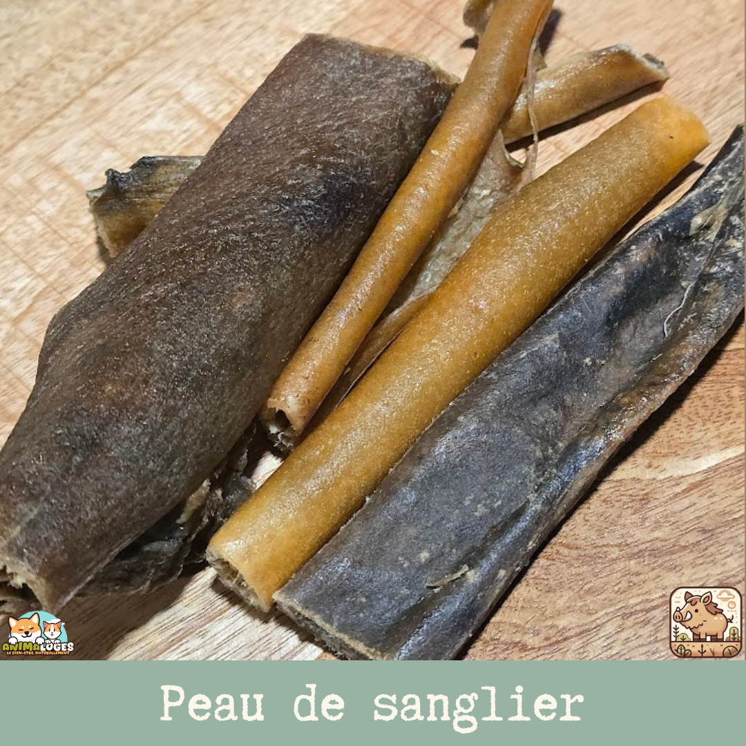 Les friandises de peau de sanglier pour chien, 100 % naturelles, offrent une mastication gourmande et saine, idéale même pour les chiens les plus difficiles.